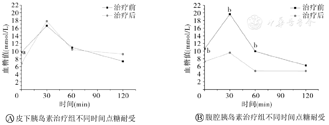 如图3所示,腹腔胰岛素治疗组0、30、60 min的糖耐受均提高(均P<0.05),皮下腹腔胰岛素治疗组除0 min(P<0.05)和60 min外,其他时间点皮下胰岛素治疗组在治疗后糖耐受均呈现下降。