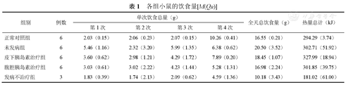 如表1所示,除发病不治疗组外,各组全天总饮食量由大到小排列为:未发病组>皮下胰岛素治疗组>腹腔胰岛素治疗组>正常对照组。根据2种饲料的成分表可知,在同等质量条件下,高脂高糖饲料热量更高。根据摄入热量情况,除发病不治疗组外,从高到底排列为:皮下胰岛素治疗组>未发病组>腹腔胰岛素治疗组>正常对照组,即皮下胰岛素治疗组摄入总热量最大。
