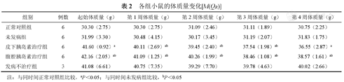 | 组别 | 例数 | 起始体质量(g) | 第1周体质量(g) | 第2周体质量(g) | 第3周体质量(g) | 第4周体质量(g) |