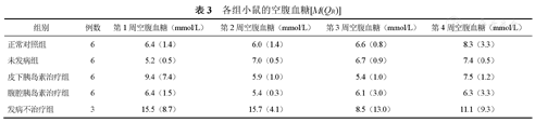 | 腹腔胰岛素治疗组 | 6 | 6.4(1.5) | 5.4(0.3) | 6.1(3.0) | 6.3(3.3) |