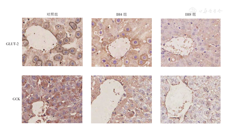 肝组织石蜡标本切片、脱蜡、水化,高温、高压抗原修复,抗原封闭,加兔抗鼠GLUT-2、GCK一抗(一抗稀释浓度分别为1∶100和1∶150),4℃过夜,复温,加山羊抗兔二抗,DAB染色,复染、封片。显微镜观察实验结果,光镜下采图,利用Image-Pro Plus图像软件测定灰度值,对实验结果进行定量分析。