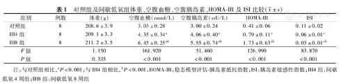 暴露结束后3组大鼠体重之间差异无统计学意义(P>0.05)。与对照组相比,IH4组、IH8组空腹血糖、空腹胰岛素及HOMA-IR升高,ISI降低(P均<0.05),且以IH8组变化更为明显(P<0.05),见表1。