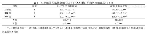 对照组及间歇低氧组GLUT-2、GCK蛋白平均灰度值比较(