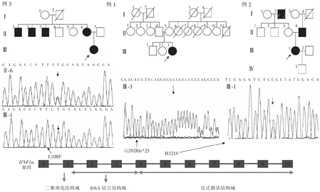 注:箭头表示先证者;圆圈表示女性,方框表示男性,空心框表示血糖正常,实心框表示临床诊断糖尿病,斜杠为去世个体,例3中Ⅲ-1及Ⅱ-6存在相同突变。例1~3突变分别位于第4外显子、第5外显子、第1外显子编码区