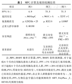 注:MPC:MODY概率计算器;PPV:MODY阳性预测值,对于起病6个月内应用胰岛素的人群而言,PPV>5%可建议行基因检测,对于起病6个月内未使用胰岛素的人群,PPV>20%时建议行基因检测;PVS:零效突变(移码突变),可致基因功能丧失;PS1:既往文献已有该位点致病性报道;PM2:在正常人群数据库中的频率为-,为低频变异;PP3:生物信息学蛋白功能预测软件SIFT、PolyPhen _2、REVEL均预测为致病