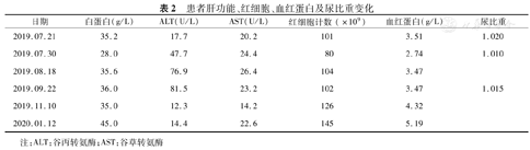 患者肝功能、红细胞、血红蛋白及尿比重变化