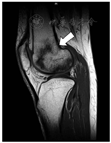 骨梗死是指由于干骺端或骨干的骨细胞及骨髓细胞血供中断,从而发生缺血、坏死引起的病理改变。《股骨头坏死临床诊疗规范》提出:有或无高危因素,有或无临床症状和体征,符合下述检查之一即可诊断股骨头坏死:(1)X线片:坏死灶被硬化带包绕,节段性塌陷,新月征,股骨头塌陷但关节间隙维持。(2)MRI:T1WI,带状低信号;T2WI,双线征;T2WI抑脂,坏死灶周缘高信号带;T2WI抑脂,股骨头、颈除病灶区外骨髓水肿,且T1WI为带状低信号。(3)CT:轮廓清晰的坏死灶,软骨下骨折[6]。其中骨梗死的诊断为:MRI示长骨骨干或干骺端骨髓呈地图样改变,晚期CT及X线片示骨髓钙化或骨化影。骨梗死后骨修复未造成骨组织在X线上的密度发生改变时,X线平片和CT不能发现,随后由于梗死灶周围充血水肿、新生骨形成而导致骨质疏松并夹杂硬化带,X线和CT无特征性,不能排除化脓性感染和某些恶性肿瘤,而MRI对骨髓病变敏感性高,为诊断急性骨梗死的首选方法[7]。本病例的诊断依据临床症状、病史及MRI结果。