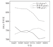 患者,女性,63岁,主因"反复腰腿疼痛14年"入院。患者于2006年因"特发性血小板减少性紫癜"使用大剂量激素治疗(强的松每日12片间断服用约1年的时间)后出现腰背部及腿部疼痛,逐渐加重至不能行走,就诊于华西医院内分泌代谢科后诊断为严重骨质疏松症,予以阿仑膦酸钠片、阿法骨化醇及钙尔奇D3治疗后疼痛症状缓解。6年前(2014年)无明显诱因出现双膝关节疼痛明显伴活动受限,完善CT及MRI(磁共振成像)提示膝关节上方股骨远端骨质破坏,髓腔内密度不均成地图样改变,多系骨梗死(图1)。收入内分泌代谢科后予以唑来膦酸(密固达)、普通维生素D3、钙尔奇D3和阿法骨化醇治疗后双膝关节疼痛逐渐缓解。此后患者分别于2015年9月24日、2016年10月14日、2017年12月13日、2019年2月28日及2020年5月30日,先后共6次输注唑来膦酸抗骨质疏松治疗。经治疗后患者双膝及腰背部疼痛明显缓解(VAS评分0分),双膝活动自如。2020年5月复查MRI提示:右股骨远端、右侧髌骨内见不规则地图样混杂信号影,与2014年比较,水肿影消失,病灶缩小且边界清楚(图2)。患者经过6年唑来膦酸治疗,双能X线吸收检测法(DXA)骨密度提示腰椎骨密度能够维持并较前有一定增长(图3),L1-4平均值增加2.5%,股骨颈及全髋分别降低约8.7%和7.8%。骨转换标志物也控制在较低水平(表1),从中也可以观察到唑来膦酸对于骨吸收的抑制作用远大于对骨形成的抑制。