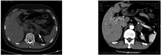 该患者为体检时意外发现左侧肾上腺占位,无不适症状,无库欣综合征典型体征(宽大紫纹、多血质、满月脸、近端肌肉萎缩、皮肤菲薄、瘀斑、近端肌无力等),经过内分泌功能评估后符合SCS。这种没有库欣综合征典型特殊体征和症状但有自主分泌糖皮质激素的临床综合征称为SCS,据估计,每10万人中有79例病例,SCS比经典的库欣综合征更为常见,多数在肾上腺意外瘤患者中被发现和确诊。该病诊断目前没有统一的标准,日本学者提出新的诊断标准,午夜1 mg DST皮质醇的3个主要临界值:5.0,3.0和1.8 μg/dl。单用1 mg地塞米松后血清皮质醇≥5 μg/dl已足以判断血清皮质醇分泌的自主性,目前以血清皮质醇≥3 μg/dl为标准的1 mg DST仍可继续使用。临床证据表明,1 mg DST后血清皮质醇≥1.8 μg/dl并不总是正常的,因此对于那些达到临界值和基础促肾上腺皮质激素水平低于10 pg/ml和夜间血清皮质醇≥5 μg/dl的患者,考虑存在SCS[1]。本例患者采用1 mg DST血清皮质醇1.8 μg/dl为切点,且次日晨8点促肾上腺皮质激素水平小于2.2 pmol/L为诊断标准。SCS患者缺乏典型库欣综合征的临床表现,易被忽视,但SCS也存在增高的皮质醇,可导致糖脂代谢异常、骨质疏松、肥胖等,增加椎骨骨折风险及心血管事件发生率[2,3]。因此尽早的从肾上腺意外瘤中甄别出SCS意义更大[4]。