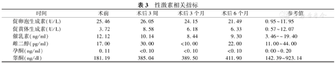 | 术后3个月 | 皮质醇(μg/dl) | 8.64 | 35.43 | 同上 | ||