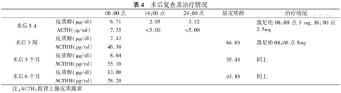 | 术后3周 | 皮质醇(μg/dl) | 7.42 | 84.63 | 泼尼松08:00点5mg | ||
