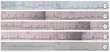 入院后给予抗感染、营养心肌、控制心率、利尿等对症治疗,口服美托洛尔缓释片75 mg、每日3次和盐酸胺碘酮200 mg、每日1次,心率维持在95~110次/min。1个月时患者出现自主排痰能力差、呼吸困难,因急性呼吸衰竭行气管插管建立人工气道后转入重症监护病房(ICU)。入ICU时患者血压129/77 mmHg,心率90~104次/min,窦性心律;心脏彩超示:主动脉瓣退行性变,主动脉瓣、二尖瓣关闭不全,左室收缩功能正常范围。入ICU第2天血压降至85/50 mmHg,中心静脉压(CVP)9 mmHg,持续泵入NE 0.095 μg·kg-1·min-1维持血压;约0.5 h出现房颤,心率116~136次/min,应用美托洛尔、去乙酰毛花苷、胺碘酮控制心室率,效果不佳。第4天给予普罗帕酮静脉推注(静推),心率最慢可降至95次/min,但患者心率下降的同时出现血压下降(90/60 mmHg),调整NE剂量,最高达0.286 μg·kg-1·min-1,患者血压升高的同时心室率随NE用量增加而持续增加,最快达165次/min,随后NE减量,心室率也同步减慢,心电监护仍示室上性心动过速与房颤交替,完善相关检查排除电解质紊乱、甲状腺功能异常等可能导致心率加快的因素,不除外NE相关性快速心律,鉴于患者目前血压仍低,给予特利加压素持续泵入维持血压。第6天,当NE用量减至0.040 μg·kg-1·min-1时,心率降至80~100次/min,心电监护仍提示阵发性室上性心动过速与房颤交替;NE用量减至0.015 μg·kg-1·min-1时,患者恢复窦性心律,心率维持在60~72次/min。第12天患者血压平稳,停止泵入NE并予以特利加压素维持2 d成功撤机拔管,转至普通病房继续治疗20 d后好转出院。出院后追踪患者1月余,其一般情况可,心率维持在60~70次/min。心电图结果见图1。