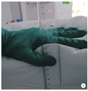 1.2.3.2 气管切开>5 d患者:①测量气管切开管连接呼吸机螺纹管的高度(图3);②测量软枕+无弹性较厚棉垫受压后的高度(图4),选择受压后大于气管切开管连接呼吸机螺纹管高度的翻身垫。俯卧后气管切开套管能较垂直地放置,避免挤压。