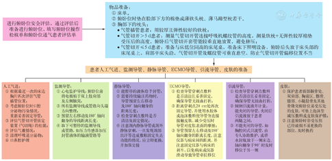 | □心率>40次/min或<130次/min□无疑似心肌梗死□无新出现的心律失常或药物治疗无效的心律失常□收缩压或舒张压下降<20%□血管活性药物治疗后MAP>65 mmHg□ MAP<110 mmHg□ RASS≤-4分 | □放置鼻空肠管 □未放置鼻空肠管且暂停□确认无胃残留量 肠内营养≥2 h□确认各引流导管是否能夹闭并妥善放置和固定□确认各静脉导管穿刺点敷料无渗出,妥善固定□确认气道通畅 □确认人工气道导管固定妥善□确定气囊充盈 □清除口鼻腔分泌物□保护受压部位皮肤 | |