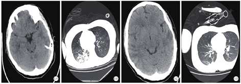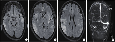 患者不能完全排除自身免疫性脑炎,转入ICU后,给予阿昔洛韦抗病毒、甘露醇脱水降颅压、乙酰谷酰胺营养脑细胞、静脉注射人免疫球蛋白和甲泼尼龙琥珀酸钠调节免疫、丙戊酸钠和左乙拉西坦控制癫痫等综合治疗。入院第4天,患者心率偏慢,最慢为40次/min左右,考虑存在自主神经功能紊乱,给予心宝丸及环磷腺苷葡胺提升心率;约4 d后心率逐渐恢复至75~120次/min,停用心宝丸和环磷腺苷葡胺。入ICU后仍间断出现癫痫发作,加用拉莫三嗪和苯巴比妥控制癫痫发作。入院第7天,患者血清及脑脊液自身免疫性脑炎相关抗体检测为阴性,脑脊液病原微生物基因组检测提示:猫立克次体感染(检出序列数261)。考虑患者存在立克次体感染可能,停用甲泼尼龙琥珀酸钠,给予盐酸米诺环素胶囊及甲磺酸左氧氟沙星氯化钠抗感染。入院第10天,患者间断出现呼吸暂停,伴有血氧饱和度下降,给予经口气管插管,呼吸机辅助呼吸。入院第12天,复查颅脑CT未见明显异常(图1A);胸部CT显示双肺多发高密度影,右肺上下叶部分支气管欠通畅,考虑感染性病变(图1B)。考虑患者肺部感染较重,给予头孢哌酮舒巴坦钠抗感染。入院第14天,复查脑脊液为无色清亮液体,压力约为217.6 mmH2O;脑脊液常规、蛋白未见明显异常。入院第15天和第16天,分别组织全院病例讨论及解放军总医院远程会诊,主要诊断考虑癫痫持续状态(难治性)、重症脑炎,脑炎性质考虑立克次体感染,不除外病毒感染,继续抗立克次体、抗病毒、丙种球蛋白抑制免疫反应、控制癫痫发作等治疗。入院第22天,第二次腰穿送检脑脊液病原微生物基因检测未再检测出猫立克次体。于当日复查颅脑CT显示双侧颞顶叶多发条片状稍低密度影,提示有脑炎可能(图1C);胸部CT显示双肺多发高密度影,右肺下叶部分支气管欠通畅,提示较前明显好转(图1D)。继续给予阿昔洛韦抗病毒,米诺环素及甲磺酸左氧氟沙星氯化钠抗立克次体治疗。入院第23天,拔除气管导管,患者呼吸平稳。入院第25天,患者出现皮疹,皮肤科会诊考虑:过敏性皮炎,重症多形性红斑?(药物引起可能性大)。给予甲泼尼松龙琥珀酸钠注射液60 mg静脉滴注,再次给予人免疫球蛋白0.4 g·kg-1·d-1静脉滴注,连用5 d。入院第27天起,患者的意识逐渐转清,可下床活动,能够配合指令完成动作,未再出现肢体抽搐。入院第32天,第3轮丙种球蛋白治疗结束,当日完善颅脑磁共振成像(magnetic resonance imaging,MRI)检查显示双侧额顶颞岛叶异常信号,考虑炎症,建议治疗后复查;右侧横窦、乙状窦较对侧纤细,考虑发育变异(图2)。入院第33天,患者转回普通病房,意识清,无头痛,无发热,颜面部及颈前皮疹较前减轻,四肢活动基本正常。入院第46天,患者好转出院,出院时意识清,问话对答切题,未见新发皮疹,四肢肌力5级,双侧巴宾斯基征阴性。出院4个月后,患者再次出现癫痫发作,复查颅脑MRI显示双侧额顶颞岛叶异常信号基本吸收、消失,脑部MRI增强未见异常强化(图3)。继续口服左乙拉西坦片,未再出现癫痫发作。