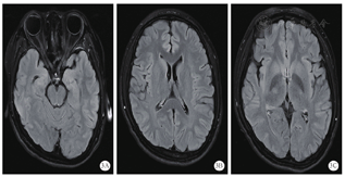 患者女性,18岁,右利手,学生。以"发热1周,意识不清8 h"于2020年1月29日入院。患者1周前开始出现发热,最高体温38.0 ℃左右,口服退热药物后体温正常,但一直精神萎靡、倦怠,不愿与他人交流。入院前8 h左右患者再次出现发热,最高体温37.3 ℃,伴恶心、无呕吐,呼之反应差,不语,不配合语言指令,上述症状持续不缓解;无肢体麻木无力,无复视,无饮水呛咳,无听力下降,无肢体抽搐等不适,遂来本院就诊。入院查体:体温37.6 ℃,脉搏60次/min,呼吸频率18次/min,血压99/51 mmHg(1 mmHg=0.133 kPa);意识模糊,精神差,不能言语,双侧瞳孔等大等圆(直径3.0 mm),对光反射存在,双眼球各方向运动不配合;双侧鼻唇沟对称,伸舌居中,颈软;四肢肌力、肌张力正常,感觉、共济查体欠合作,双侧巴宾斯基征阴性,脑膜刺激征阴性。入院时颅脑CT平扫未见明显异常。入院当天给予完善相关血常规、红细胞沉降率(血沉)、血生化、凝血常规等检查,并进行腰椎穿刺检查,结果提示:血常规、C-反应蛋白(C-reactive protein,CRP)、凝血常规、肝肾功能、血脂无明显异常;血沉28 mm/1 h(正常参考值为0~20 mm/1 h);肌酸激酶(creatine kinase,CK)2 397 U/L(正常参考值为5~200 U/L);乳酸脱氢酶(lactate dehydrogenase,LDH)4.4 μmol·s-1·L-1(正常参考值为1.5~4.0 μmol·s-1·L-1)。脑脊液呈无色透明,压力为224.4 mmH2O(1 mmH2O=0.0098 kPa),脑脊液检查提示:脑脊液常规、生化分析、特定蛋白组合、一般细菌涂片、抗酸杆菌涂片、真菌涂片、墨汁染色均未见明显异常。入院诊断:中枢神经系统感染,病毒性脑炎可能性大。给予阿昔洛韦抗病毒治疗。入院当天夜间,患者突发意识障碍,四肢抽搐,牙关紧闭,口吐白沫,尿失禁,考虑为癫痫全面强直阵挛发作,给予地西泮注射液静脉推注,并加用丙戊酸钠抗癫痫。患者频繁出现癫痫发作,遂转入重症监护病房(intensive care unit,ICU)治疗。