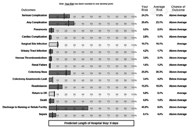 老年患者麻醉与术前的风险评估是一个综合性评估的过程,主要包括病史和系统回顾、麻醉相关体格检查、多学科会诊以及麻醉相关风险评估。目前已形成多种整合了患者因素及手术因素的评估工具,其中美国外科医师协会国家外科质量改进项目(ACS-NSQIP)风险模型计算器整合了手术特异性与20种患者的危险因素[3]。专门针对心血管并发症的风险计算器则包括Gupta围术期风险计算器[4]和改良心脏风险指数(RCRI)[5]等。此例患者术前合并有较为严重的心脏及肺部相关疾病,通过ACS-NSQIP风险模型计算器,计算出其围术期各系统并发症的发生风险大多高于平均值(见图1)。这些系统并发症包括肺部感染、心脏并发症、尿路感染、血栓栓塞症、肾脏衰竭与败血症,其再入院风险与死亡率也高于平均水平。对于此类患者,更应通过术前多学科的联合会诊优化其各系统术前状态,尽量减少围术期并发症的发生风险。