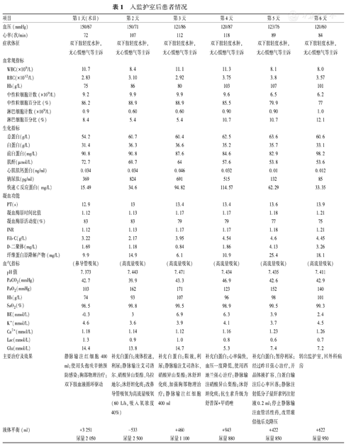 | 主要治疗及效果 | 静脉输注红细胞400 ml;使用头孢呋辛钠预防感染;胸部物理治疗;双下肢血液循环驱动 | 补充白蛋白;液体控速,利尿;静脉输注艾司洛尔、硝酸异山梨酯、乌拉地尔;沐舒坦化痰;改鼻导管吸氧为高流量吸氧(60 L/h,吸入氧浓度40%) | 补充白蛋白;限液,利尿;静脉输注艾司洛尔、硝酸异山梨酯;沐舒坦化痰、加强胸部物理治疗;静脉输注红细胞400 ml | 补充白蛋白;心率偏快,血压一度降低,使用西地兰强心治疗;静脉输注硝酸异山梨酯;沐舒坦化痰;抗生素升级为舒普深+甲硝唑 | 补充白蛋白;暂停利尿;经过昨日强心治疗,并晶体液扩容、白蛋白输注后心率回落;静脉注射低分子量肝素钙注射液0.2 ml;停止静脉输注血管活性药,改胃灌倍他乐克降压 | 转出监护室,回外科病房 | |