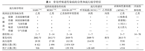 医护人员职业暴露风险与呼吸道传染病的暴发、流行情况、危害程度以及传播途径有关。《中华人民共和国传染病防治法》将传染病分为甲类、乙类和丙类,同时可以决定增加、减少或者调整传染病病种并予以公布[4]。目前证据表明,上述呼吸道传染病主要以接触传播和飞沫传播为主。开放性肺结核除经飞沫传播外,还经空气传播,经空气传播的传染病为水痘、麻疹、结核。常见呼吸道传染病的分类和流行病学特点见表1。