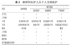 国家卫生健康委办公厅发布的《新冠肺炎疫情期间医务人员防护技术指南(试行)》[15]对于医务人员在医疗活动中的防护技术和防护用品的使用范围作出了规范的指导。麻醉医护人员的个人防护应在标准预防的基础上,根据职业暴露风险制订针对不同病种在手术室及业务环境的不同区域实施医疗操作时的分级防护策略,以期在合理利用有限医疗资源的同时,做好科学防护,落实精准管理。