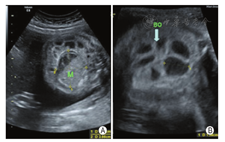 产前超声可发现胎儿肠管扩张、积液,为肠梗阻的间接征象,但较难直接判断梗阻原因及准确定位。一旦发现肠管扩张、羊水增多等异常征象,应密切观察肠管蠕动情况,有无腹水、腹内混合性包块及远端肠管充盈状况等,可及时发现继发性肠穿孔、胎粪性腹膜炎、结肠细小症等并发症。而值得注意的是,肠梗阻继发肠穿孔后往往使原来扩张的肠管消失不见,导致声像图表现不典型;此外,肠穿孔后会出现腹水征、腹水无回声区内细小密集点状或条索状带状强回声,腹盆腔内、肠道表面、肝表面散在钙化斑等,随着病情进展,病灶与周围肠管、大网膜粘连形成不规则强回声包块伴钙化灶,游离腹水逐渐减少、与周围组织粘连形成固定的包裹性囊样结构。故腹内混合性包块往往表现复杂不易辨认,需要结合肠管扩张病史及包块动态变化等综合分析,与腹内其他混合性肿块作出鉴别[7]。
