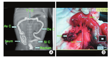 孕妇,31岁,孕2产1,孕期体健,否认孕期用药史,育有一女,2岁体健。孕26+3周行胎儿产前系统超声检查,超声显示:单活胎,生长指标可,羊水过多;小肠管广泛扩张、积液,内径最宽处约1.4 cm;胎儿腹内混合性团块,大小约4.2 cm×3.7 cm×3.2 cm,较固定,与周围组织分界不清;扩张肠管远端显示不满意。超声诊断:胎儿肠管扩张,小肠肠管狭窄或闭锁可能,继发性胎粪性腹膜炎?远端肠管显示不满意(图1)。后陆续进行胎儿超声心动图检查、定期孕期保健及超声随诊,未发现胎儿伴发其他畸形及染色体异常。在当地医院分娩一男婴,出生时即发现全腹膨隆伴口唇发绀,大便未解。全腹CT示:肠管明显扩张,直肠及乙状结肠空虚状伴腔内密度较高,腹腔内多发钙化灶。出生后2 d上述症状不减,遂转至我院小儿外科,门诊拟"①新生儿肠梗阻:先天性肠闭锁?胎粪性腹膜炎?②新生儿肺炎"收住入院。腹部X线检查示:肠腔积气积液。超声检查:房间隔缺损,肝、胆、脾、胰、双肾、输尿管、膀胱未见明显超声异常,腹腔内见多发钙化灶,肠管广泛扩张,最宽处约2.2 cm,考虑肠梗阻、继发性胎粪性腹膜炎可能。结肠造影示:小肠梗阻;结肠管腔较细,结肠袋未显示,结肠细小症?(图2A)。