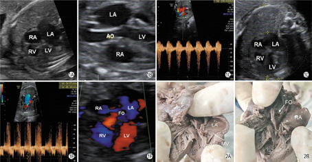 超声检查后7 d,在我院行羊膜腔内注射利凡诺引产,经阴道分娩一死产男婴,外观无异常。尸检显示:左房大,二尖瓣瓣叶及瓣下腱索明显增厚(图2A),卵圆孔小(图2B),证实超声诊断结果。