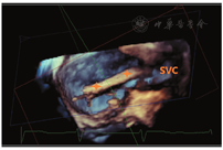 手术过程:患者于复合手术室取平卧位,常规消毒铺巾,静脉复合麻醉后。①穿刺左侧桡动脉监测血压,穿刺右侧股动脉/股静脉分别置入6F/6F鞘管,右冠状动脉造影正常,然后于右冠状动脉内放置冠状动脉导丝(ASAHI SION PTCA Guide wire,0.014″×180 cm)以标记右冠状动脉与三尖瓣后瓣环的空间位置关系。②穿刺右侧颈内静脉,预置1把ProGlide后,穿刺置入9F鞘管,然后进入Amplatz Superstiff (Amplatz Superstiff J Tip Guider wir,0.035′×260 cm)导丝,并在二维(2D)TEE食管中段上下腔切面监测下将导丝置入下腔静脉入口处(图3),退出9F鞘管,将18F K-clip可调弯鞘(下称大鞘)在2DTEE和(或)三维(3D)TEE食管中段上下腔切面监测下缓慢推进至右房中下部(图4),并固定于无菌床头固定器上。③沿大鞘进入K-Clip可调弯输送系统至大鞘末端并后撤大鞘4~5 cm,在2DTEE、3DTEE及DSA引导下调整K-Clip输送系统至三尖瓣瓣环前后叶交界处(图5),并拧入固定螺丝,张开K-Clip夹合臂并调整夹合臂方向与三尖瓣瓣环切线平行,进行夹合(图6,图7)。④夹合术后即刻彩色多普勒显示TR程度由5+(极重度)减少至2+(中度)(图8),连续多普勒记录三尖瓣平均跨瓣压差为1 mmHg,3DTEE描记三尖瓣瓣口面积由术前8.50 cm2减少至5.33 cm2(图9),2DTEE检查无瓣叶损伤及心包积液,冠状动脉造影提示RCA中远端50%左右压迫狭窄,前向血流TIMI 3级,此时患者血压为116/70mmHg,心率为70次/min,基本平稳,逐释放K-Clip夹合器,撤出输送系统并退出大鞘,ProGlide血管缝合右侧颈内静脉,手术完成。