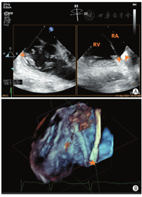 该例患者为继发于心房颤动的FTR,三尖瓣瓣环显著扩及减少TR的作用,2D、3DTEE在评估FTR患者瓣环形态、大小、反流颈形态部位以及K-Clip™术中引导和评价中具有重要作用。