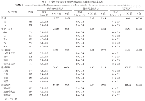 Scores of transitional health management demands of elderly patients with chronic disease by personal characteristics