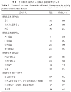 随着寿命的延长,老年人常见疾病发病率和伤残率逐年上升,我国60岁以上老年人近半数(53.2%)患有高血压、糖尿病等慢性疾病[1]。老年患者慢性病患病率从高到低排列依次是高血压、脑血管疾病、糖尿病、慢性阻塞性肺疾病、类风湿性关节炎和缺血性心脏病[2]。老年患者的慢性病具有病程长、流行广、费用高、致残致死率高等特点,是因病致贫、返贫的重要原因,如不及时有效控制,将带来严重的社会经济问题。《"健康中国2030"规划纲要》明确指出:促进健康老龄化,建立老年医疗卫生服务体系,将居家、社区、机构养老与慢性病防治管理结合起来,加强健康指导和综合干预。在老年慢性病管理等卫生服务模式上进行创新,重点进行疾病监测、档案管理、诊疗建议、康复服务等[3]。延续性健康管理(transitional health management)又称过渡期健康管理,是通过一系列的行动设计,使患者能够在不同的健康照护场所(如医院、社区、家庭)都能够受到协作与连续的照护,是住院护理服务走向社区健康管理的延伸[4]。延续性健康管理可以改善患者预后,提高治疗依从性,降低再住院率,降低医疗费用,改善患者生活质量,提高医疗资源的利用率[5]。国外延续性健康管理工作开展相对较早。20世纪90年代,美国就将延续健康管理服务应用到老年慢性病患者的出院后社区随访工作当中,通过评估患者病情,制定相应健康管理方案,大幅降低医疗费用[6]。我国目前相关研究与实践尚处于起步阶段,在延续性健康管理措施、评价指标等方面有很大提升空间[7]。本研究通过问卷调查法,了解并分析老年慢性病患者延续性健康管理服务需求现状,归纳总结延续性健康管理服务措施,指导老年慢性病患者的防治工作。