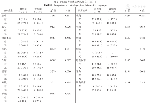 | 临床症状 | 对照组(n=34) | 观察组(n=17) | χ2值 | P值 | 临床症状 | 对照组(n=34) | 观察组(n=17) | χ2值 | P值 | ||