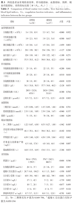 两组患者白细胞计数、中性粒细胞计数、淋巴细胞计数、血小板计数、血红蛋白、血细胞比容、丙氨酸氨基转移酶、天冬氨酸氨基转移酶、谷氨酰转肽酶、乳酸脱氢酶、总胆红素、三酰甘油、低密度脂蛋白、肌酐、活化部分凝血活酶时间、纤维蛋白原、纤维蛋白原降解产物、铁蛋白、红细胞沉降率、超敏C反应蛋白、白介素2受体、白介素6、白介素8、白介素10、肿瘤坏死因子α比较,差异无统计学意义(P>0.05);观察组患者白蛋白高于对照组,D-二聚体低于对照组,凝血酶原时间短于对照组,差异有统计学意义(P<0.05,见表3)。
