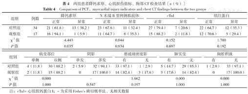 观察组患者降钙素原异常率低于对照组,差异有统计学意义(P<0.05);两组患者N末端B型利钠肽前体异常率、cTnI异常率、肌红蛋白异常率、病变部位、阴影及磨玻璃密度影情况、肺实变情况、胸腔积液发生情况比较,差异无统计学意义(P>0.05,见表4)。