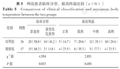Comparison of clinical classification and maximum body temperature between the two groups