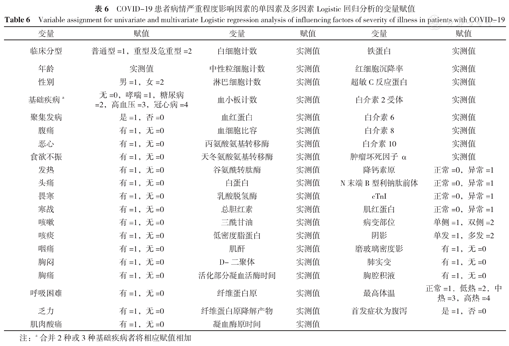 COVID-19患者病情严重程度影响因素的单因素及多因素Logistic回归分析的变量赋值
