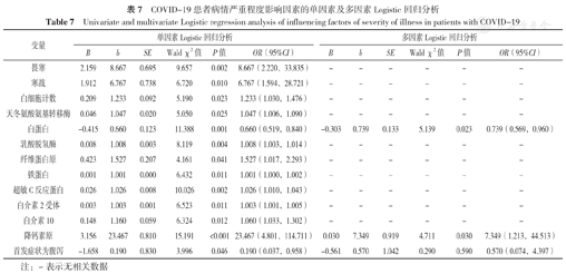 COVID-19患者病情严重程度影响因素的单因素及多因素Logistic回归分析