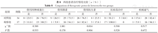 两组患者使用丙种球蛋白、激素、抗生素治疗情况及行抗病毒治疗、机械通气情况比较,差异无统计学意义(P>0.05,见表8)。
