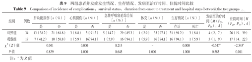 两组患者肝功能损伤、心肌损伤、急性呼吸窘迫综合征、休克发生情况及生存情况、发病至治疗时间比较,差异无统计学意义(P>0.05);观察组患者住院时间短于对照组,差异有统计学意义(P<0.05,见表9)。