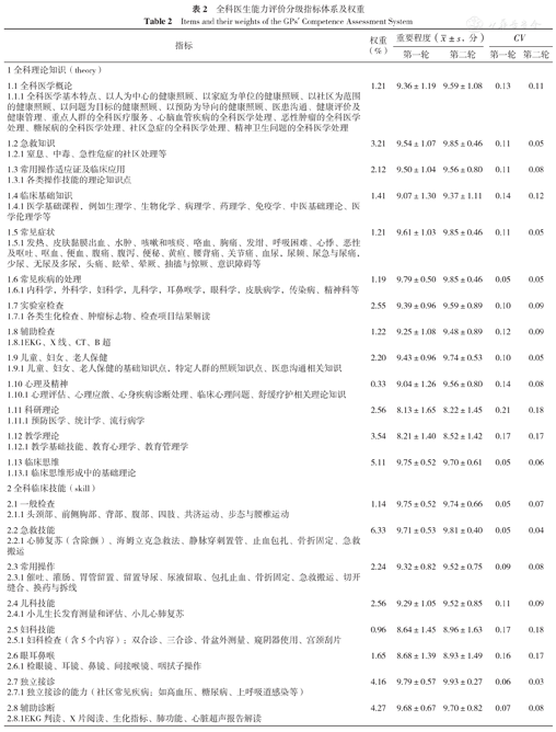 第一轮专家共提出9条修改意见,分别为:(1)"全科理论知识(theory)"维度"临床基础知识"二级指标下的三级指标中增加基本中医理论知识;(2)"全科理论知识(theory)"维度"儿童、妇女、老人保健"二级指标下的三级指标中增加医患沟通相关知识;(3)"全科理论知识(theory)"维度中医学基础课程:《组胚学》建议改为《免疫学》更为实用;(4)"全科理论知识(theory)"维度"心理及精神卫生"二级指标下的三级指标中增加舒缓疗护相关理论知识;(5)"全科临床技能(skill)"维度"辅助诊断"二级指标下的三级指标中增加肺功能、心超报告解读;(6)"全科临床技能(skill)"维度"穿刺操作"二级指标下的三级指标中增加社区常用外周动脉穿刺;(7)"全科临床技能(skill)"维度"授课讲座"二级指标下的三级指标中增加健康教育讲座考核;(8)"全科人文素养(humanity)"维度"人文理念"二级指标下的三级指标中增加宗教常识考核;(9)"全科临床技能(skill)"维度中科研考核内容过多,建议删除。通过查阅文献及专题小组讨论,采纳专家所提(1)~(8)条建议,并更新至第二轮问卷中。第二轮专家共提出1条修改意见,为在"全科理论知识(theory)"维度中增加医学伦理相关知识。各条目重要性得分均分及CV结果见表2。