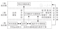整合医疗型是指将包括健康促进、疾病预防、治疗和运动康复等在内的各种医疗服务进行整合,为患者提供全生命周期的连续性服务。整合医疗型推出的初衷在于以体医融合的模式来积极应对人口老龄化,最初是以预防老年人跌倒为目的的"预防跌倒教室""跌倒护理教室",以及以营造健康为目的的"健康体力咨询会""健康教室"等,均是直接面向居民的活动[15]。20世纪80年代,日本政府制定了介护保险制度,旨在通过介护保险方式减轻医疗保险的负担,直接推动了日本医疗机构由单一的基础医疗服务向提供保健、医疗、福祉一体化的综合服务模式转变[16]。1985年日本厚生劳动省针对当时较为突出的医疗资源配置不合理等问题,根据地理、人口、交通等因素建立了三级医疗圈,并将体医融合嵌入各级医疗圈(见图1)。具体而言,以市町村为基础发展一级医疗圈,主要承担常见病的诊治、提供基本的运动处方服务;将临近的市町村医疗资源整合加上区域医疗支援医院形成二级医疗圈,二级医疗圈的医疗支援医院常由家庭医生、护士、药师、营养师和运动专家等组成,如果病情需要,专科医生也可以参与进来,为患者提供集医疗、康复和保健于一体的住院服务;三级医疗圈主要是特定功能医院,为患者提供更为专业的医疗服务[17],并在此基础上构建了完善的家庭医生支援制度,形成了从预防到早期发现、早期治疗和康复在内的体医融合保健体系[18]。整合医疗型体医融合促进模式最大的特点在于服务的整体性和各级医疗资源的联动性。在各级医疗圈中整合体医融合健康促进服务可以为老年人和慢性病患者的健康促进提供一体化的服务。联动性则体现在各级医疗点诊断记录、运动处方、康复记录会形成电子病历,作为上一级医疗诊断的参考。在费用支付方面,如果患者前往一级医疗圈进行初诊则70%以上的费用可以由医疗保险报销,如果跨区域就诊则报销的比例将减少[19]。