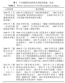 | 2000年"健康日本21"(2000—2010年) | 2000年《21世纪黄金计划》、2001年厚生省《健康父母和儿童21》、2003年厚生省《健康增加法》、2005年食育推进委员会《食育基本法》、2006年文部省《为了增进健康的运动指南2006》《为了增进健康的运动指针2006》、2008年《学校保健安全法》、2010年《活跃少年儿童计划》、2010年《体育立国战略》 |