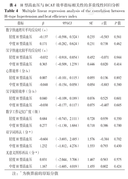 由于3组研究对象的居住情况存在差异,故采用多重线性回归以排除混杂因素的影响,分别以BCAT分测验得分(赋值:实测值)及其效率指标(赋值:实测值)作为因变量,以H型高血压严重程度(赋值:1=单纯性高血压,2=轻度H型高血压,3=中度H型高血压)为自变量进行多重线性回归分析,结果显示,以单纯性高血压组作为对照,中度H型高血压与心算得分呈负相关(P=0.028),与其余BCAT各指标得分无相关关系(P>0.05,见表3);H型高血压患者与BCAT各指标反应时无相关关系(P>0.05,见表4)。