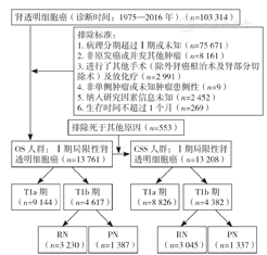2020年4—5月申请获得SEER数据库使用权限并从数据库下载1975—2016年103 314例经病理诊断为ccRCC(原发肿瘤部位编码:C64.9;组织学编码:8310/3)患者的临床病理资料。依据排除标准,共13 761例Ⅰ期局限性ccRCC患者(OS人群:总体生存人群;诊断年份:2010—2015年)纳入研究,其中9 144例为T1a期,4 617例为T1b期〔病理分期依据美国癌症联合委员会(AJCC)第7版TNM分期[8]执行〕;T1b期OS人群中3 230例采用RN,1 387例采用PN。OS人群排除死于其他原因的患者后剩余13 208例Ⅰ期局限性ccRCC患者(CSS人群:肿瘤特异性生存人群),其中8 826例为T1a期,4 382例为T1b期;T1b期CSS人群中3 045例采用RN,1 337例采用PN(见图1)。