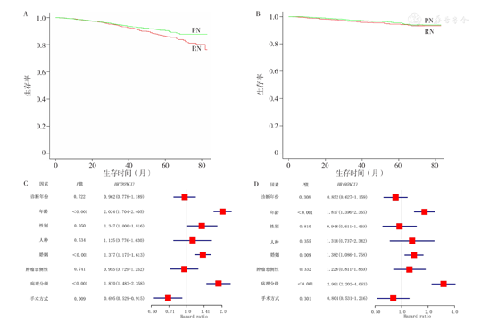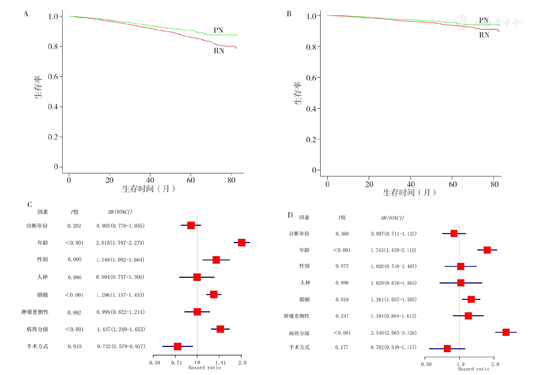 为了更准确地验证两种术式的预后影响,利用Kaplan-Meier曲线对可视化匹配后的样本进行分析,结果显示,PN对患者OS仍然有益(P=0.027),而对CSS无明显作用(P=0.232,见图3A,图3B)。为排除其他因素干扰,以生存状态和生存时间为因变量,以诊断年份、年龄、性别、人种、婚姻、肿瘤患侧性、病理分级和手术方式为自变量(赋值情况同2.1),代入多因素Cox比例风险回归模型,结果显示:与RN相比,PN是患者OS独立保护因素(HR=0.695,P=0.009,见图3C,图3D)。
