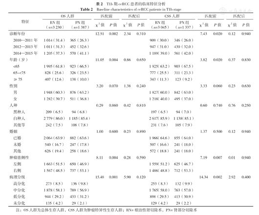 肾细胞癌(renal cell carcinoma,RCC)是最常见的泌尿系统恶性肿瘤之一,在组织学上,肾透明细胞癌(clear cell renal cell carcinoma,ccRCC)是最常见的RCC亚型(80%~90%)[1,2]。在欧盟国家,2018年RCC的新发病例约99 200例,并且39 100例患者的死亡与RCC密切相关[3]。目前,手术是局限性RCC的首选治疗方案。欧洲泌尿外科协会指南[4]推荐,肾部分切除术(partial nephrectomy,PN)是Ⅰ期ccRCC的首选方案;而美国国立综合癌症网络指南[5]指出,PN和根治性肾切除术(radical nephrectomy,RN)均是T1b期局限性RCC患者的一线手术方案。目前,GERSHMAN等[6]研究发现,RN和PN与T1NanyM0期RCC患者的全因死亡率和肿瘤特异性死亡率均无统计学差异;而VENKATRAMANI等[7]回顾性分析发现,与RN相比,PN对T1bN0M0期RCC患者总体生存率(overall survival,OS)有利。因而,本研究基于监测、流行病学和最终结果(Surveillance,Epidemiology,and End Results,SEER)数据库观察PN和RN对T1b期局限性ccRCC患者OS和肿瘤特异生存率(cancer specific survival,CSS)的影响并探究Ⅰ期局限性ccRCC患者的独立预后因素,为临床泌尿外科医师的手术决策提供参考。
