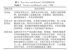 1956年TRUELOVE等[3]为了解UC患者疾病状态与乙状结肠镜下表现和病理组织学特点之间的关系而对42例UC患者和24例非UC患者进行了对比分析,通过分析111个UC患者活检标本发现,临床缓解的患者中有半数以上的患者存在内镜下或显微镜下组织病理学疾病活动,37%的乙状结肠镜检查正常的患者存在着持续性的组织学炎症,并以此研究制定了第一个UC病理组织学评分系统——True-Love and Richard's评价指数,该评分系统从黏膜结构、上皮细胞完整性、炎性细胞浸润程度、糜烂和隐窝脓肿等方面对黏膜组织学炎症严重程度进行评价,并分为3个等级:(1)无炎症;(2)轻度至中度炎症;(3)重度炎症(详见表1)。