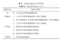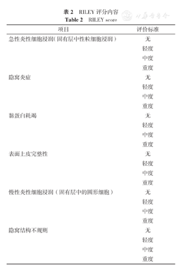 1991年RILEY等[4]为判断UC患者直肠显微镜下炎症是否与其疾病预后密切相关而分析了82例处于内镜下缓解状态的UC患者的显微镜下组织学炎症状态,并建立了一个包含急性炎性细胞浸润、隐窝炎症、黏蛋白耗竭、表面上皮完整性、慢性炎性细胞浸润、隐窝结构不规则6个评价指标的评分系统,称为RILEY评分。该评分系统的每个评价指标均设立了4个等级,分别为无、轻度、中度、重度(详见表2)。