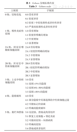 总之,Robarts组织病理学指数、Nancy指数和Geboes分级标准均有不完善的地方,且不可互相替代。如Robarts组织病理学指数的评估指标虽然较Nancy指数详细,并在急性炎性细胞浸润中对固有层和上皮层的中性粒细胞浸润分别进行了评价,但却较Geboes分级标准简单,未对黏膜结构变化和隐窝改变进行描述;Robarts组织病理学指数与Geboes分级标准在评价疾病组织学活动程度方面具有强相关性,但是在评价疾病组织学缓解方面一致性较低,而Nancy指数和Geboes分级标准在评价疾病组织学缓解方面一致性较高[20,21,22]。故临床需要寻找更为完善的评分体系。