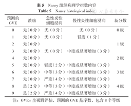 2017年Marchal-Bressenot等为了建立一个能有效评估UC疾病活动的评分系统而通过多元线性回归和bootstrap创建了一个与全视野评估(GVE)最匹配的指数——Nancy病理学指数(详见表5),并对其有效性、可靠性、反映性、与临床的相关性进行了验证[18]。Nancy组织病理学指数包括溃疡、急性炎性细胞浸润、慢性炎性细胞浸润3个组织学评价指标,并根据急慢性炎性细胞的浸润程度和溃疡是否存在把疾病的活动程度划分为从0(没有组织学炎症活动)到4(严重活动性疾病)的5个疾病活动级别,将Nancy指数≤1定义为组织学缓解。